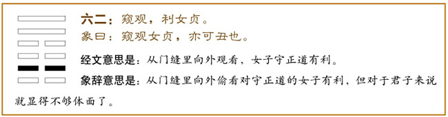 像女人一样从门缝里看人,这对干君子来说是不体面的。但对女人则不属于过失。女人天生比男人害羞,比男人腼腆,这无可厚非。并且还能显示出女人的阴柔美。六二阴爻居于偶位为得位,又居中且与九五相应,所以她的行为是很正常的。但是这种“窥”得是出干正道的偷看。如果见到美男子就想入非非,偷偷观看,就不吉祥了。所以说“利女贞”,即这种行为要符合道德规范。