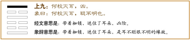 噬嗑第六爻,爻辞:上九:何校灭耳,凶。爻辞释义